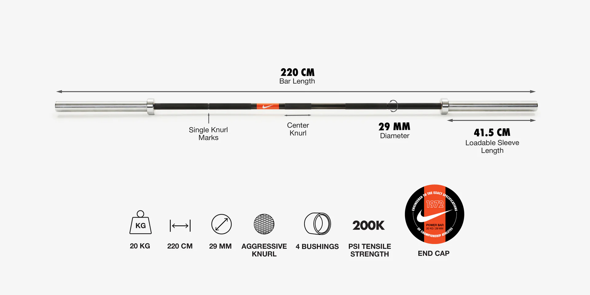 BARRE D’HALTÉROPHILIE – Nike 1972 Power Bar – 20 kg – Black Chrome – NIKE STRENGTH : conçue pour les athlètes exigeants, cette barre de puissance allie résistance, précision et confort de prise. Son design distinctif avec la bande orange “Power Stripe” de Nike reflète l’ADN de performance et de fiabilité de la marque.