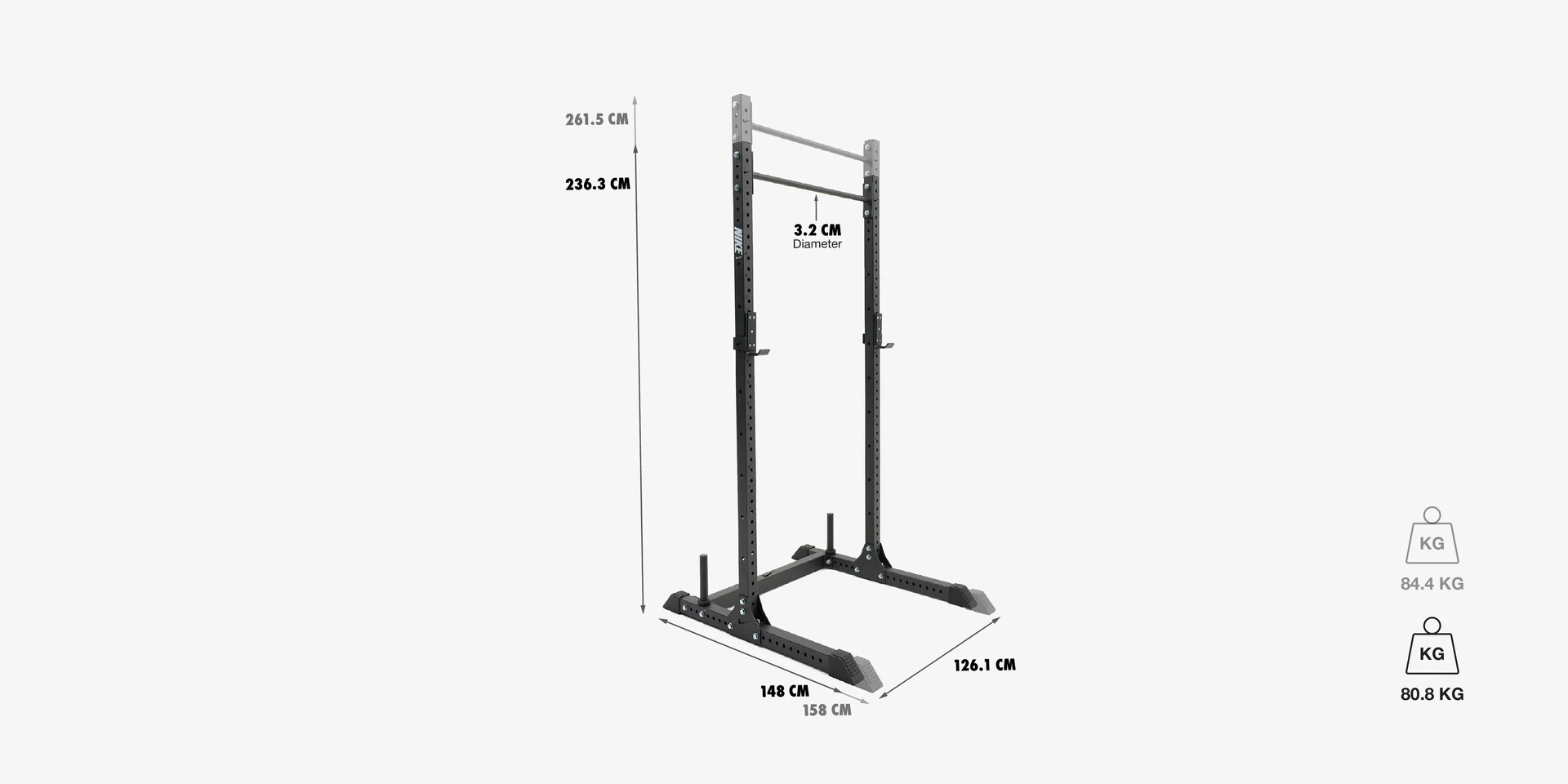 Son avantage ? Une structure en acier 75x75 mm ultra-résistante avec barre de traction intégrée, J-cups réglables et rangements pour disques.